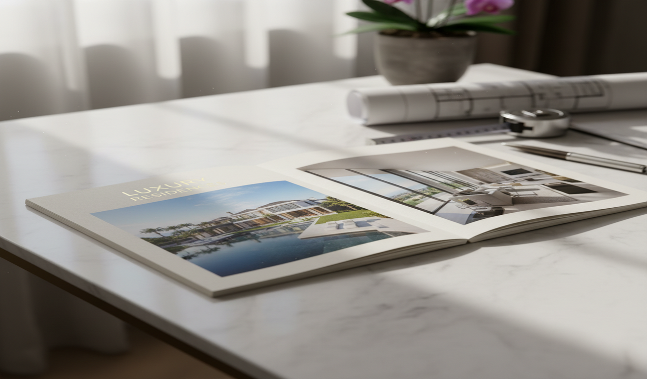 Premium vastgoedbrochures zijn de hoeksteen van elke campagne. Ze verlengen het verkoopgesprek, structureren uw verhaal en vertalen de kwaliteit van het project tastbaar. Kandidaten bewaren, annoteren en delen deze documenten. Een uitgekiende brochure maakt het verschil en verhoogt de conversie van bezoekers tot reservaties.
