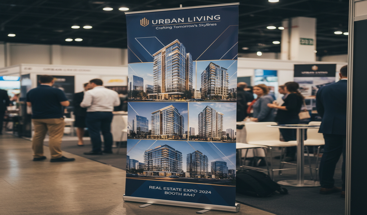 Roll-ups voor vastgoed plaatst u in enkele seconden in een verkoopkantoor, onthaalruimte of op een beurs. Ze zijn makkelijk transporteerbaar, hebben een grote visuele impact met een beperkte investering én zijn snel geïnstalleerd. Met roll-ups krijgt uw story letterlijk extra hoogte.