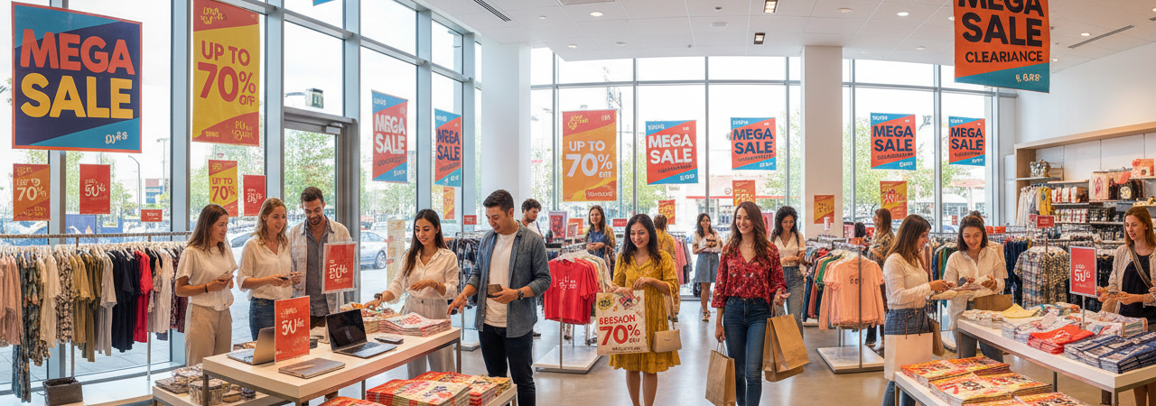 Sluit af met een directe call-to-action: winkeladres, openingsuren, bereikbaarheid of parkeerinfo en een stimulans zoals “Geniet vandaag nog van de kortingen”. Bij extreem strakke timing, doet een eenvoudige “Beperkte voorraad, op is op!” het altijd goed — vooral bij veel voetgangers in de buurt.